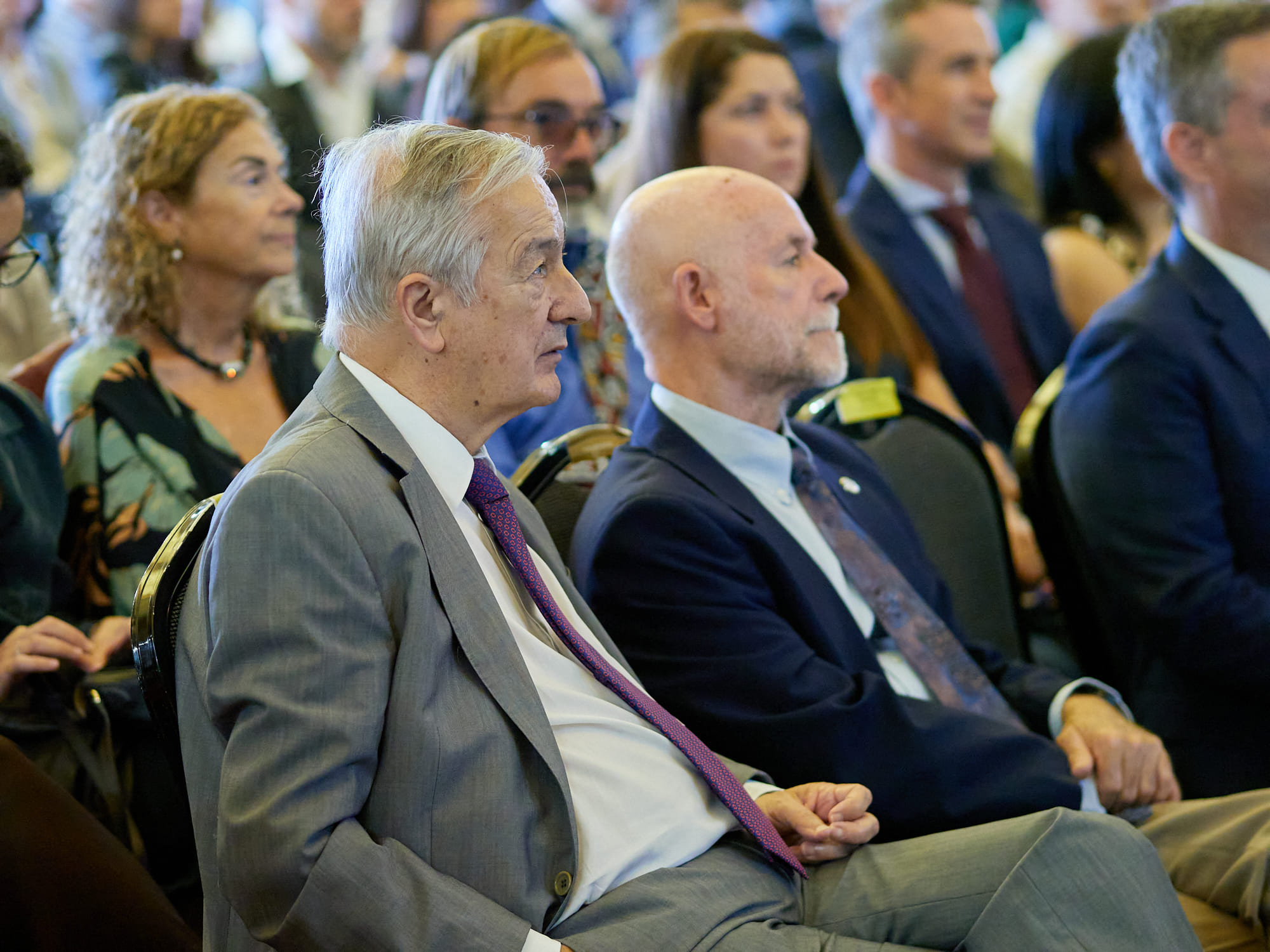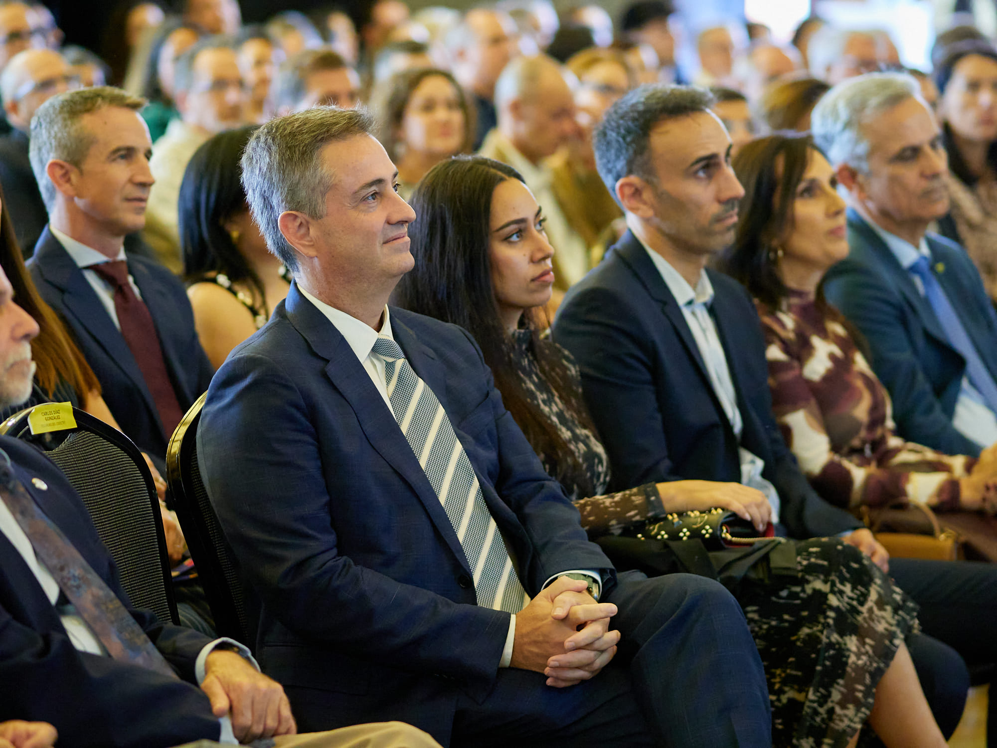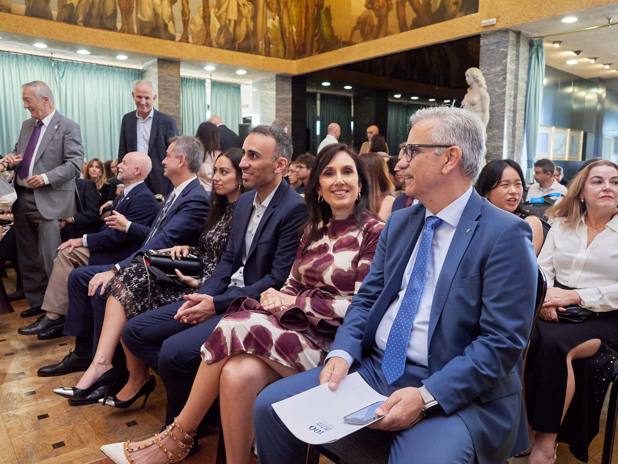 La entrega de la Medalla del Colegio a D. Enrique Ordieres Sagarmínaga estuvo también cargada de emoción. Tras el vídeo conmemorativo y la ovación del público, el presidente de Cinfa subió al escenario visiblemente emocionado, acompañado por representantes de la Comisión Permanente del Colegio, poniendo nuevamente en relieve el valor humano que envuelve a la profesión.
